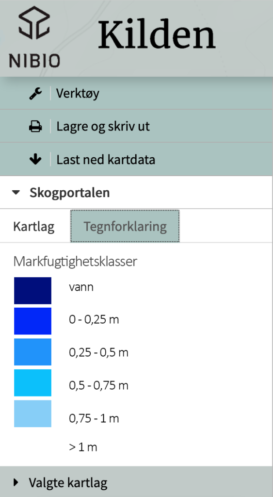 For å få tilgang til mark­fuk­tig­hets­kartet kan man enten finne det på NIBIOs kart­løs­ning Kilden, hvor mark­fuk­tig­hets­kartet ligger under skog. Velg Skogportalen på Kilden for å få tilgang på de mest rele­vante kart­la­gene for skog direkte. På Geonorge kan du enkelt søke etter «mark­fuk­tighet» og få opp infor­ma­sjon om mark­fuk­tig­hets­kartet som tjeneste (WMS) og data­sett. WMS-tjenesten gir deg mulighet til å legge inn kart­laget i et kart­pro­gram via en nett­lenke. Datasettet kan fritt lastes ned fra NIBIOs nett­sider.