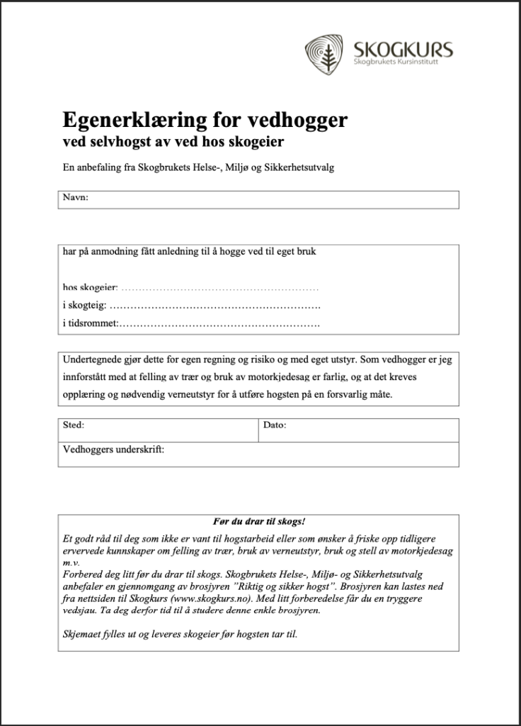Egenerklæring for vedhogger ved selvhogst av ved hos skogeier.