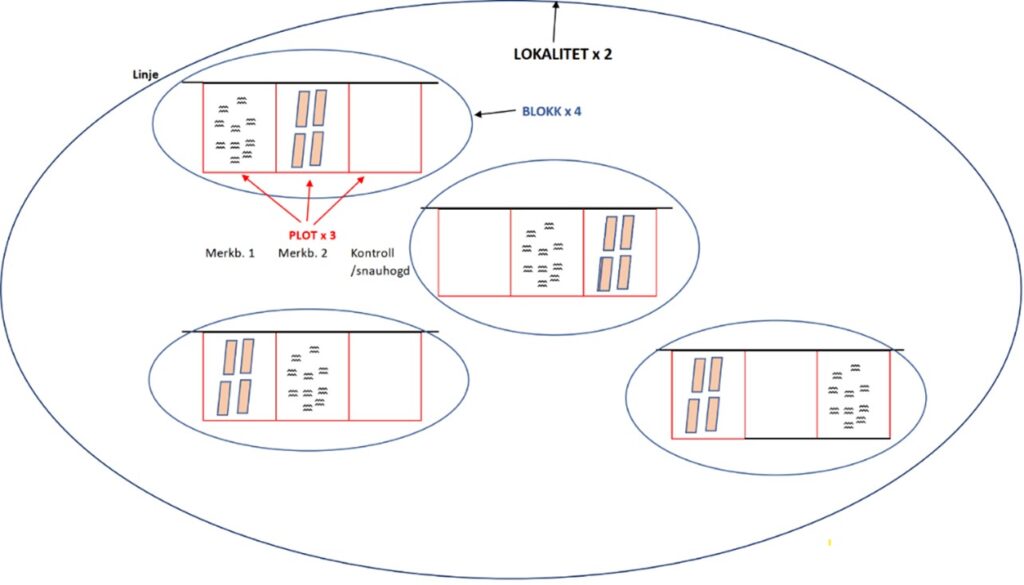 I hver blokk er det lagt ut tre plott; der to skal omfatte behandlinger (gravemaskin og markberedningsaggregat på lassbærer) og ett er kontrollfelt uten markberedning.