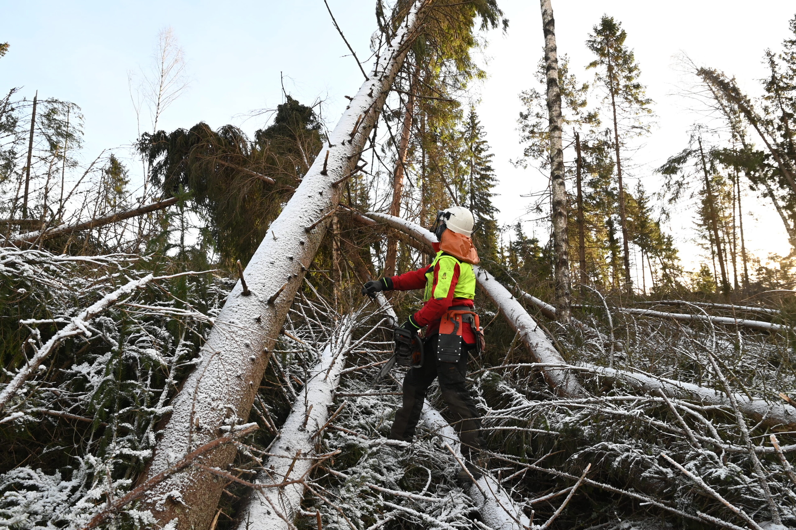 Arbeid med stormfelt skog er meget farlig og bør overlates til profesjonelle aktører.